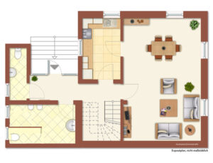 EG: Eingangsbereich, großer Raum, Küche, WC-Anlagen (Männer-Frauen getrennt), Aufgang ins